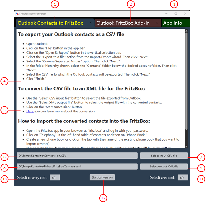 This tab describes how to transfer Outlook contacts to the Fritzbox. You can also configure and start the conversion of contacts.
