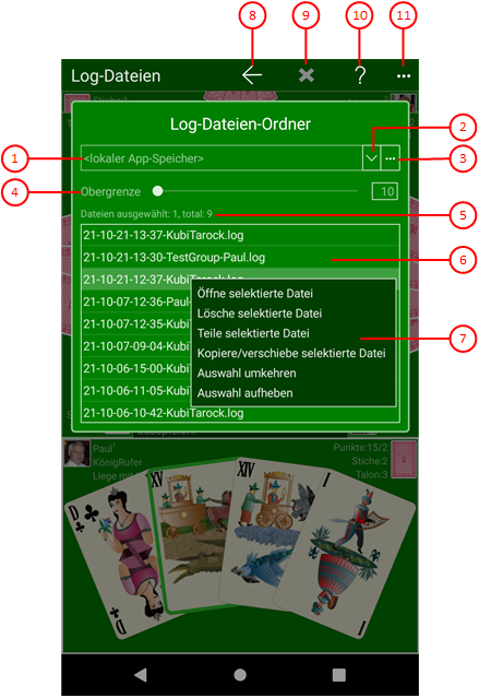 Sie können auf dieser Scheibe einen Ordner Ihrer Wahl auswählen, in dem die Log-Dateien von KubiTarock gespeichert werden. Außerdem werden dort auch Dateien gespeichert, die einem von Ihnen erzeugten E-Mail angehängt wurden. Sie können die Dateien anschauen, kopieren, löschen oder mit anderen teilen.