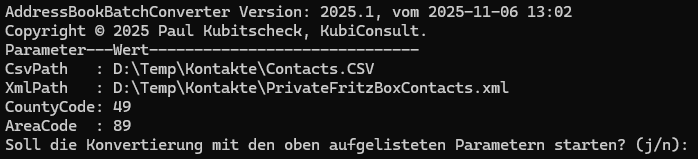 Die Abfrage "Soll die Konvertierung mit den oben aufgelisteten Parametern starten? (j/n):" kann mit dem Kommandozeilenparameter "noprompt" unterdrückt werden.
