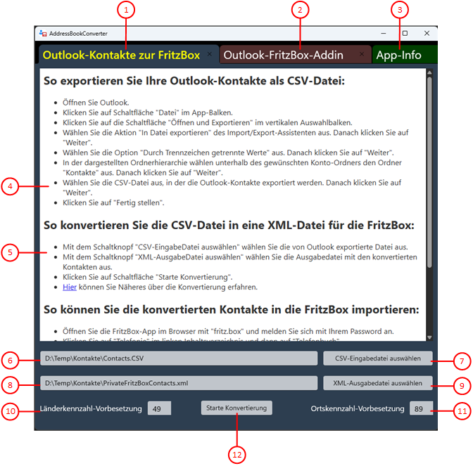 In diesem Tabulatorfenster wird beschieben, wie Sie die Outlook-Kontakte in die Fritzbox bekommen. Außerdem können Sie die Konvertierung der Kontakte konfigurieren und starten.