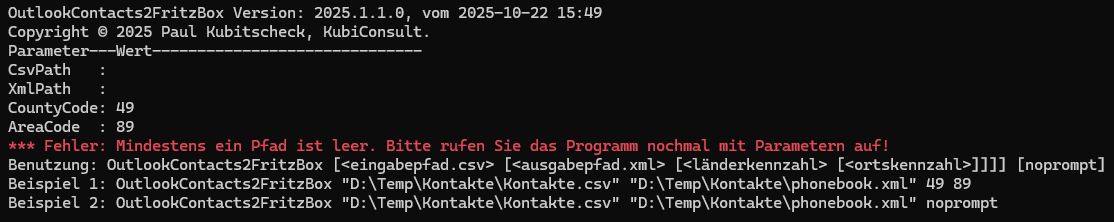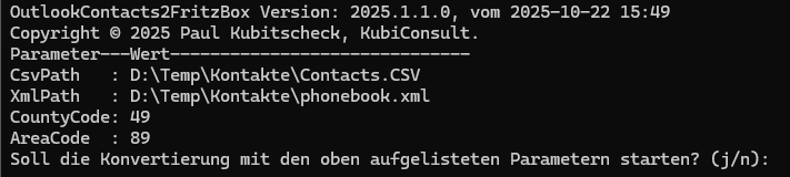 Sie können das Programm OutlookContacts2FritzBox von der App-Website runterladen und installieren. Wenn Sie es aufrufen, listet es alle Parameter auf und frägt Sie, ob Sie die Konvertierung mit diesen Parameter ausführen wollen. Falls Sie in der Kommandozeile keine Parameter angeben, verwendet es die gespeicherten gemeinsamen Einstellungsparameter.