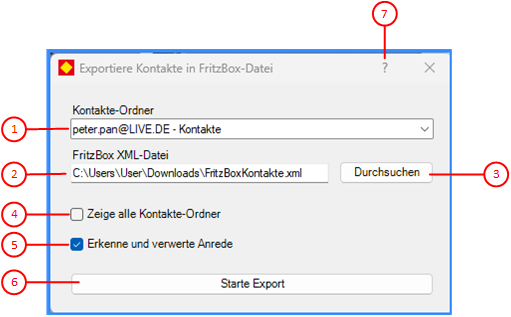 Klicken Sie auf diesen Schaltknopf, wenn Sie mit Hilfe des Dateiauswahl-Dialogs eine Ausgabedatei für den Export definieren wollen. Der Standard-Dateiname "FritzBoxKontakte.xml" ist vorgegeben. Sie können ihn aber auch ändern.