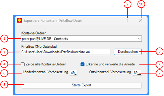 Klicken Sie auf diesen Schaltknopf, wenn Sie mit Hilfe des Dateiauswahl-Forms eine Ausgabedatei für den Export definieren wollen. Der Standard-Dateiname "FritzBoxKontakte.xml" ist vorgegeben. Sie können ihn aber auch ändern.
