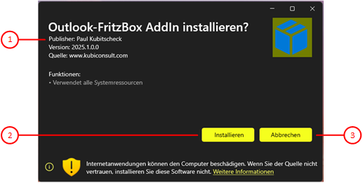 Nachdem die Datei "OutlookFritzBoxAddin.msix" runtergeladen ist, können Sie sie doppelt anklicken, dann erscheint der folgende Dialog (Bild 5).