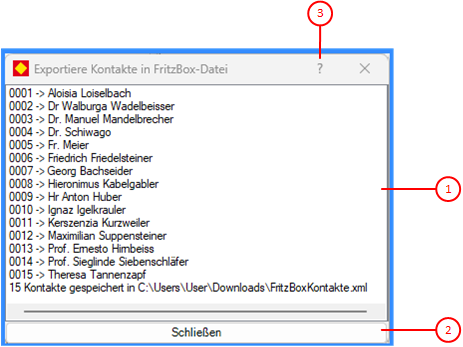 Hier werden neben einer Abschlussmeldung und eventuellen Fehlermeldungen die exportierten oder importierten Kontakte mit einer Folgenummer, einem Verarbeitungsindikator und dem vollen Namen des Kontakts angezeigt. Die folgenden Verarbeitungsindikatoren werden verwendet: