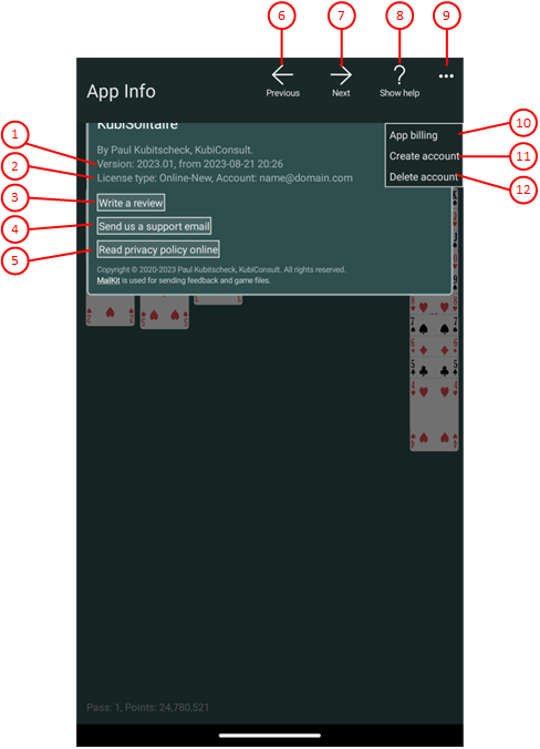 Press this button if you have noticed a problem with KubiSolitaire or would like to make a suggestion for improvement. The mail application will then be called up and you can send your request directly to KubiSolitaire support. The email already contains the current game in the attachment. But you can also delete the attachment if your request does not relate to it.