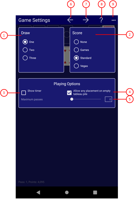 You can move the slider knob between the values 0 and 9. However, you can also set a discrete value if you click on the bar before or after the knob. If you change the number of cards to be drawn, the number of maximum passes will also change accordingly: 1 if you draw one card; 2 or 3 if you draw two or three cards. The value 0 means no limit on the number of passes and is the default setting.