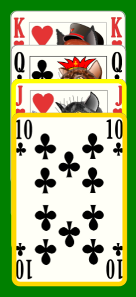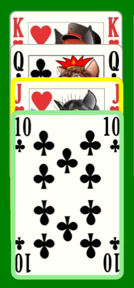 If the playing assistant has selected a card, that card is focused and gets a green-colored border (figure 25) instead of the gold-colored border (figure 24) temporarily. In figure 24 and 25 it is also recognizable that the Hearts Jack has a yellow-colored border. The yellow border is indicating the mouse pointer is over the card whereas the gold border is indicating the input focus. If the mouse pointer would also be over the Clubs 10, the border color of the focused card would be a little bit darker.
