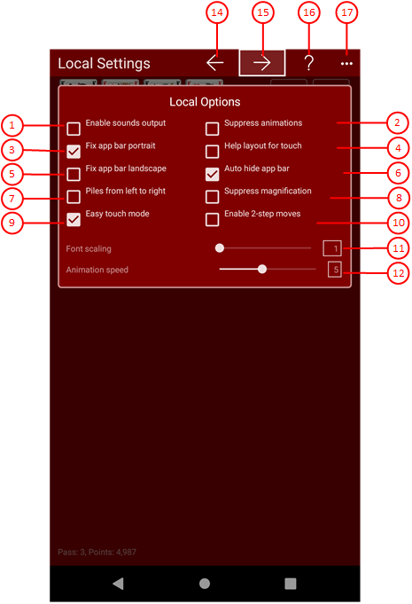 Normally, animation are enabled. If you want to play with maximum speed, you can increase the animation speed with the slider below. Alternatively, you can disable animations at all by checking this button. Only the fly-back animation cannot be suppressed. This animation brings cards back to the origin when a dragging operation has ended unsuccessfully.