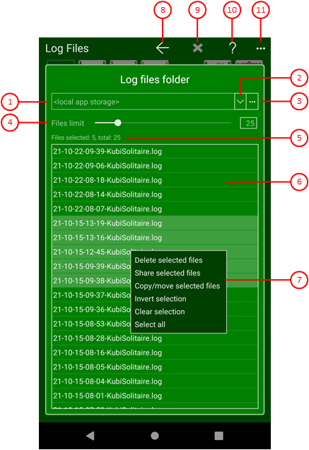 By using this slider, you can set the upper limit for game files in the local app storage between 10 and 100. Default value is 25. If the upper limit is reached, each new log file created causes the deletion of the oldest file in it. Please note, that the age of the file is determined by the game start date not by the file modification date. The game start date is used as prefix of each file name.