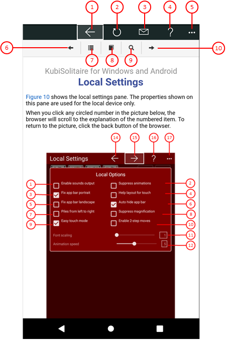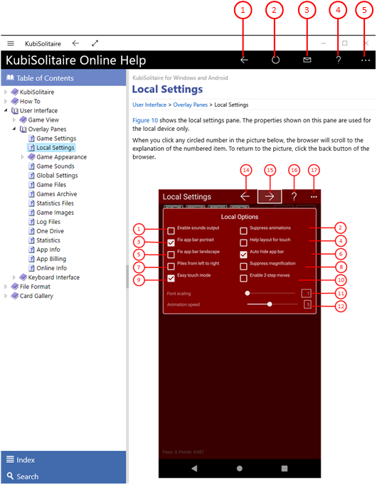 This pane displays online information about KubiSolitaire. This includes the context-sensitive help shown in the following figures. The online information can be displayed only if an internet connection is available. The pane overlays the whole game view.