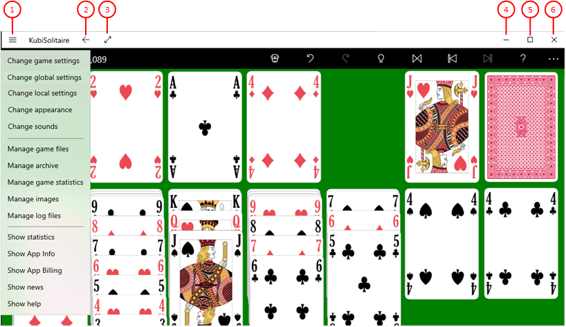 Select this command to show the app info pane. You can find information about the application on this pane and you can switch to the store to write a review about the application there. If you have a problem with KubiSolitaire, you can also send an email directly to KubiSolitaire support.