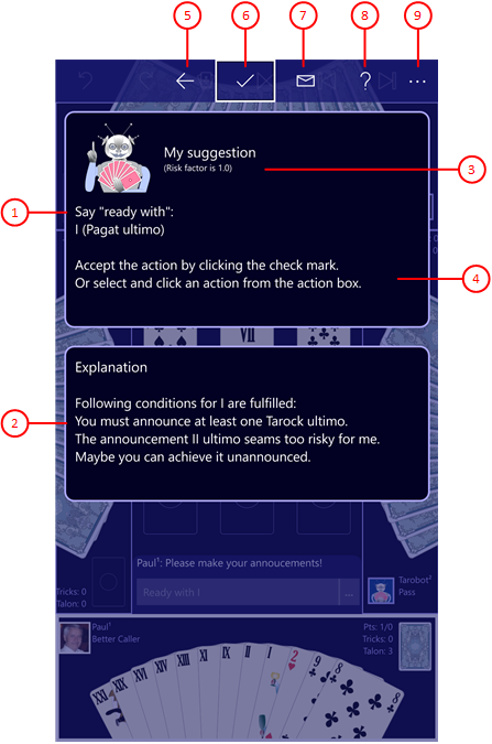 Figure 45 shows the playing assistance pane. Here, the "Tarobot" explains his suggested playing action.