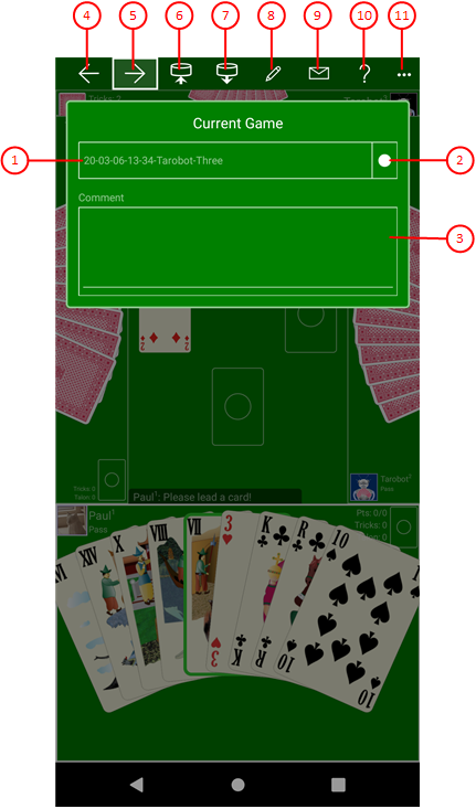 KubiTarock stores the current game in the local application storage. All game files stored before, are moved to the games archive automatically when a new game is stored.