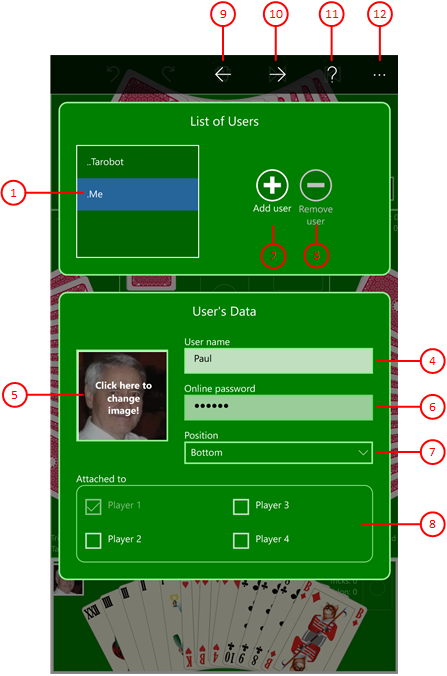 Initially, a predefined picture is used for each new user. If you want to change that, you must click on the picture. The user photo pane is shown afterwards and allows you changing the picture. For online games, it is recommended that you select a suitable image for the list entry '.Me' so that your fellow players can identify you more easily.