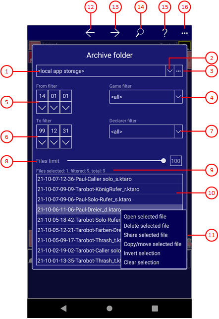 This is only visible if you are using the local app storage for the archive. With the slider you can change the upper limit for game files in the local app storage between 10 and 100. Default value is 100. User-defined folders have no limitation. If the upper limit is reached, each new file moved to the archive causes the deletion of the oldest file in it. Please note, that the age of the file is determined by the game start date not by the file modification date. The game start date is used as prefix of each file name.