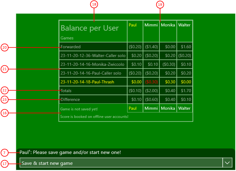In these columns, the scores per user and per game are shown. If a user controls multiple players, credits and debits of his player are summarized into a single amount. The user columns containing the last game contenders are highlighted. In an online game, after the active users, the inactive users are also displayed so that the accounting remains coherent if any are added during the session or leave early. The names of active users are highlighted compared to inactive users.