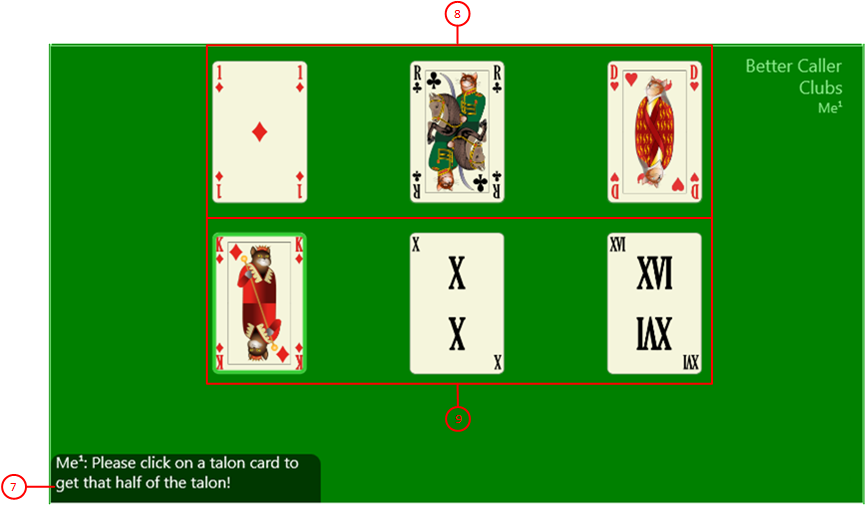 Figure 10 shows the gaming table with the Talon view. This view is shown automatically when a player has won licitation with a positive game allowing acquisition of a Talon half. It remains visible until the first card is played. The view may also be requested after game finish from the result-view of the gaming table. It shows then the Talon cards left over and their score value.