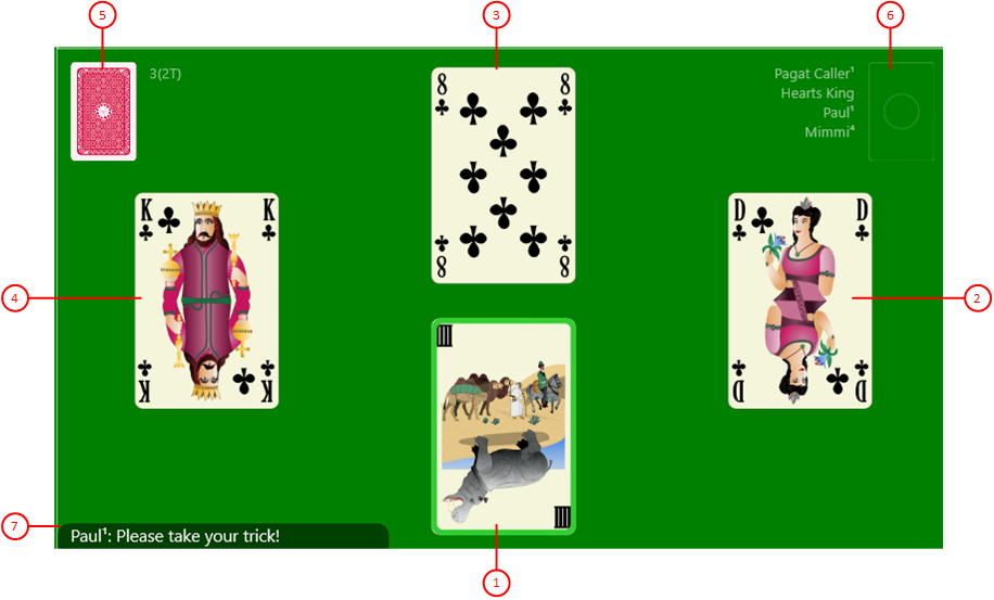 After game start, the shuffled card deck is shown here. Left beside it, the name of the current game is shown. In a caller game, the name of the called card or "4th King/Queen" is also shown respective. "4th King/Queen" is shown if the declarer himself has three Kings/Queens in his hand. Below the called card, the name of the declarer is displayed and below of that name, the name of the callee is displayed after the callee is exposed. The callee may expose himself only by playing the called card or by announcing "King ultimo" if a King is called.