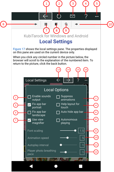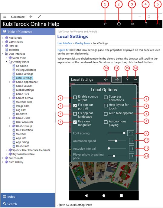This pane displays online information about KubiTarock. This includes the context-sensitive help shown in the following figures. The online information can be displayed only if an internet connection is available. The pane overlays the whole game view.