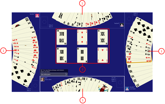 Figure 44 shows the game view in edit mode. In this mode, all card hands and the cards of the opened Talon are focusable and manipulable. The Hearts Queen in the card hand of player 2 is focused just now.