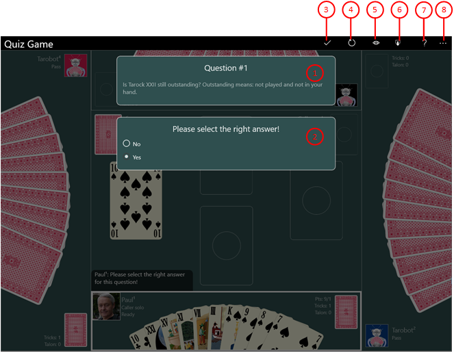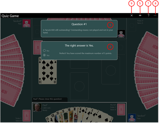 Press this button if you want to see the cards on the table again. The pane with the quiz question is then made invisible. If you press the button again, it will become visible again.