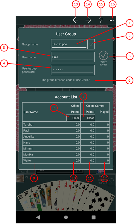 The points the users have won or lost are booked separately for offline and online games on the game accounts of the users. The offline account balances are stored locally and remain until the system user deletes them. The online account balances are stored in the Microsoft Azure database and are retained until they are deleted by the group administrator. What else happens to the account balances is the sole responsibility of the users. This applies also to the account balance of the simulator "Tarobot".
