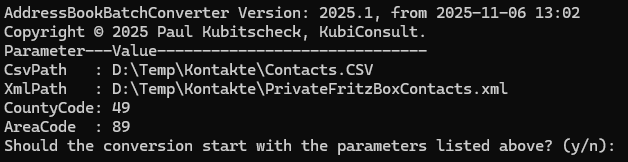 The prompt “Should the conversion start with the parameters listed above? (y/n):” can be suppressed with the command line parameter “noprompt.” .