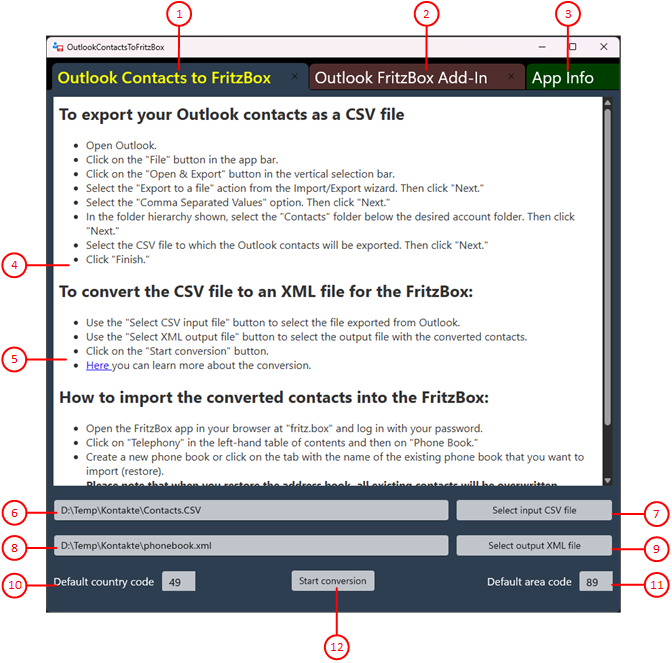 This tab describes how to transfer Outlook contacts to the Fritzbox. You can also configure and start the conversion of contacts here.