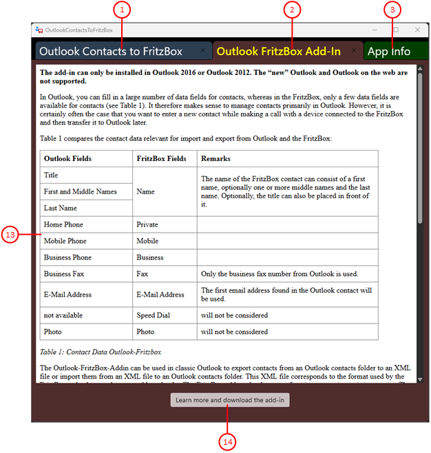 This tab describes how you can export Outlook contacts and import FritzBox contacts using an Outlook add-in. The add-in, which can only be used in Outlook 2012 and 2016, must be downloaded from our website and installed as described.