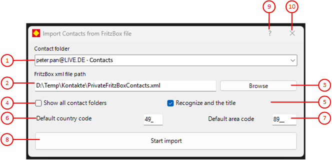 Figure 2 shows the import form of the add-in. Here you can configure and start importing your FritzBox contacts.