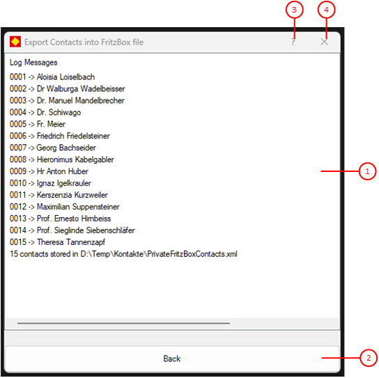 In addition to a completion message and any error messages, the exported or imported contacts are displayed here with a sequence number, a processing indicator, and the full name of the contact. The following processing indicators are used: