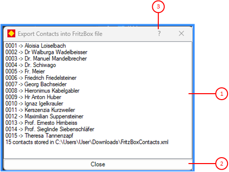 In addition to a completion message and any error messages, the exported or imported contacts are displayed here with a sequence number, a processing indicator, and the full name of the contact. The following processing indicators are used:
