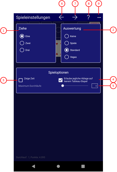 Sie können zwischen einer, zwei oder drei Karten wählen, die auf einmal vom Start- zum Ablagestapel umgeklappt werden sollen. Werden zwei oder drei Karten umgeklappt, werden sie in umgekehrter Folge auf dem Ablage-Stapel abgelegt. Wenn Sie diese Einstellung ändern und dass Spiel bereits begonnen ist, müssen Sie ein neues Spiel starten, sonst kann die Änderung nicht durchgeführt werden. Außerdem wird bei einer Änderung gleichzeitig die maximale Anzahl der Durchläufe gesetzt. Wenn Sie keine Begrenzung der Durchläufe haben wollen, müssen Sie den Wert anschließend wieder auf 0 setzen.