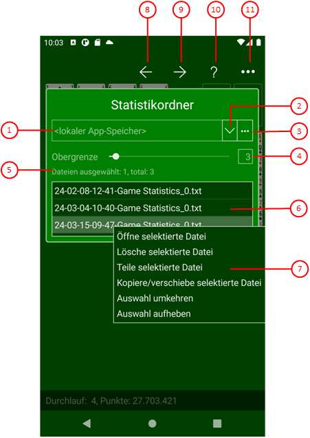 Sie können auf dieser Scheibe einen Ordner Ihrer Wahl auswählen, in dem die Statistikdateien von KubiSolitaire gespeichert werden. Außerdem können Sie Statistikdateien öffnen, kopieren, löschen oder mit anderen teilen.