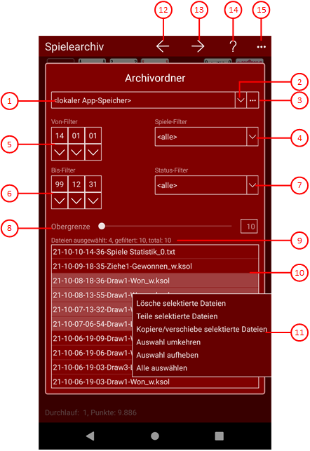 Mit dem Schiebebalken können Sie die Obergrenze für die Dateienzahl im lokalen Applikations-Speicher zwischen 10 und 100 eingestellt werden. Vorbesetzung ist 10. Für vom Benutzer ausgewählten Archivordner gibt es keine Begrenzung. Sobald die Obergrenze erreicht ist, wird für jede neu ins Archiv übernommene Datei eine ältere Datei gelöscht. Beachten Sie dabei, dass das Startdatum des Spiels das Alter der Datei bestimmt und nicht das Datum der letzten Änderung. Das Startdatum des Spiels steht jeweils am Beginn des Dateinamens.