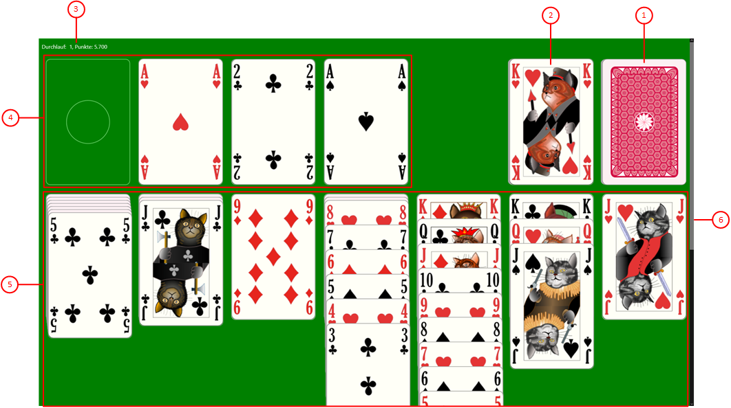 Hier werden die Anzahl der Kartenstapel-Durchläufe und der aktuelle Spielstand gemäß den Spieleinstellungen angezeigt. Falls dies in den Spieleinstellungen so festgelegt ist, wird auch die abgelaufene Zeit seit Spielbeginn in Sekunden angezeigt. Bei schmaler Spielansicht erfolgt die Anzeige des Spielstandes am unteren Rand des Spieltisches, damit der Spielstand nicht durch den App-Balken verdeckt wird.