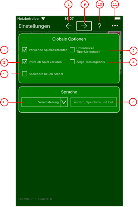 Diese Taste ist nur benutzbar, wenn Sie eine andere Applikationssprache als die aktuelle Sprache ausgewählt haben. Wenn Sie die Taste drücken, wird die Applikationssprache geändert, das Spiel gespeichert und die Applikation neu gestartet. Danach verwendet die App die geänderte Sprache.