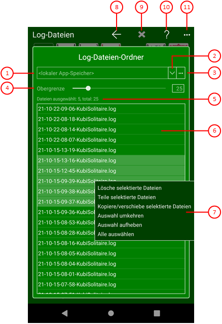 Sie können auf dieser Scheibe einen Ordner Ihrer Wahl auswählen, in dem die Log-Dateien von KubiSolitaire gespeichert werden. Außerdem werden dort auch Dateien gespeichert, die einem von Ihnen erzeugten E-Mail angehängt wurden. Sie können die Dateien anschauen, kopieren, löschen oder mit anderen teilen.
