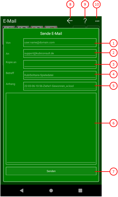 Bild 33 zeigt die Sende-E-Mail-Scheibe. Diese Scheibe wird dargestellt, wenn Sie ein Feedback an den Support schicken möchten oder wenn Sie Spieledateien mit jemanden teilen wollen.