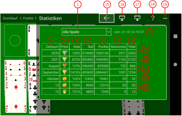 Die Spielergebnisse sind in Zeiträumen zusammengefasst. Der kleinste Zeitraum ist der Tag, der mittlere ist der Monat und der größte Zeitraum ist das Jahr. Nur im letzten gespielten Monat werden die Ergebisse pro Tag aufbewahrt. Die Ergebnisse der vorhergehenden Monate im letzten gespielten Jahr werden pro Monat und die Ergebnisse der vorhergehenden Jahre werden pro Jahr zusammengefasst.