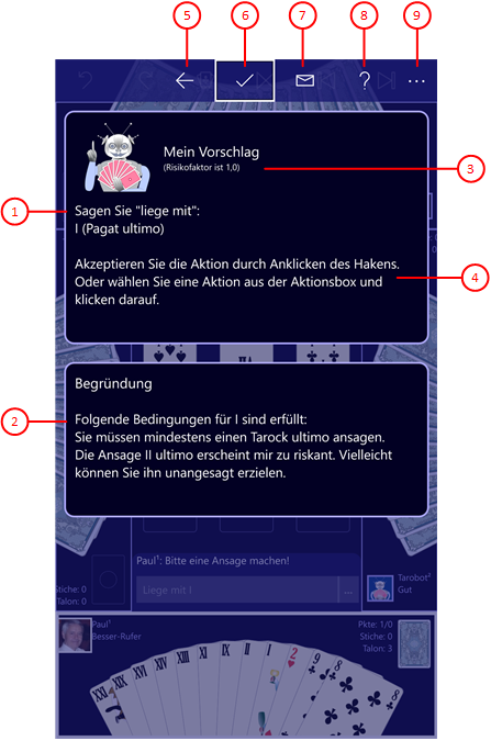 Bild 45 zeigt die Spielassistenten-Scheibe. Hier erklärt der "Tarobot" die von ihm vorgeschlagenen Spielaktion.