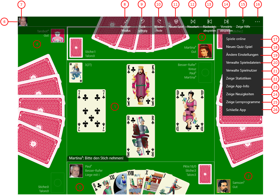 Bild 1 zeigt den wichtigsten Teil der Benutzerschnittstelle von KubiTarock - die Spielansicht. Die Spielansicht ist auf allen Geräten gleich. Je nach Gerät und Bedienmodus gibt es aber noch folgende Zusätze, die auch zur Bedienung verwendet werden können: