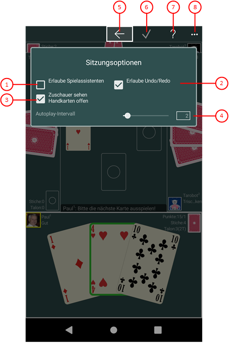 Normalerweise wird der Spielassistent in Online-Sitzungen nicht verwendet. Wenn Sie dies Option auswählen, markiert der Simulator "Tarobot" bei jedem Online-Nutzer die Aktion oder die Karte, die er selbst ausführen oder spielen würde. Um die markierte Aktion auszuführen, genügt es dann das Nutzerportrait anzuklicken oder die Zwischenraumtaste zu betätigen. Die Risikobereitschaft des Simulators können Sie auf der Spieleinstellungs-Scheibe einstellen.