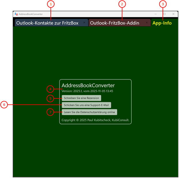 In diesem Tabulatorfenster wird beschieben, wie Sie die Outlook-Kontakte in die Fritzbox bekommen. Außerdem können Sie die Konvertierung der Kontakte konfigurieren und starten.