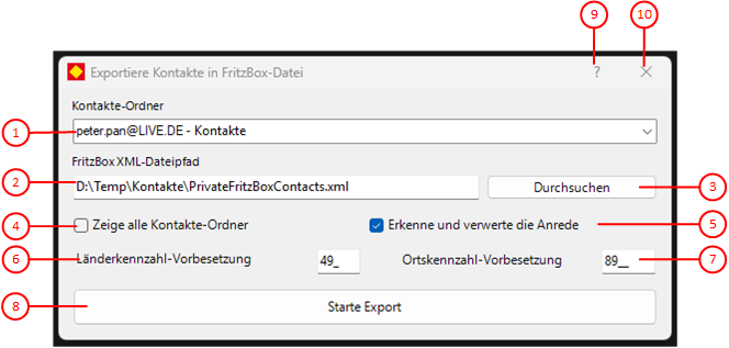 Klicken Sie auf diesen Schaltknopf, wenn Sie mit Hilfe des Dateiauswahl-Forms eine Ausgabedatei für den Export definieren wollen. Der Standard-Dateiname "FritzBoxKontakte.xml" ist vorgegeben. Sie können ihn aber auch ändern.